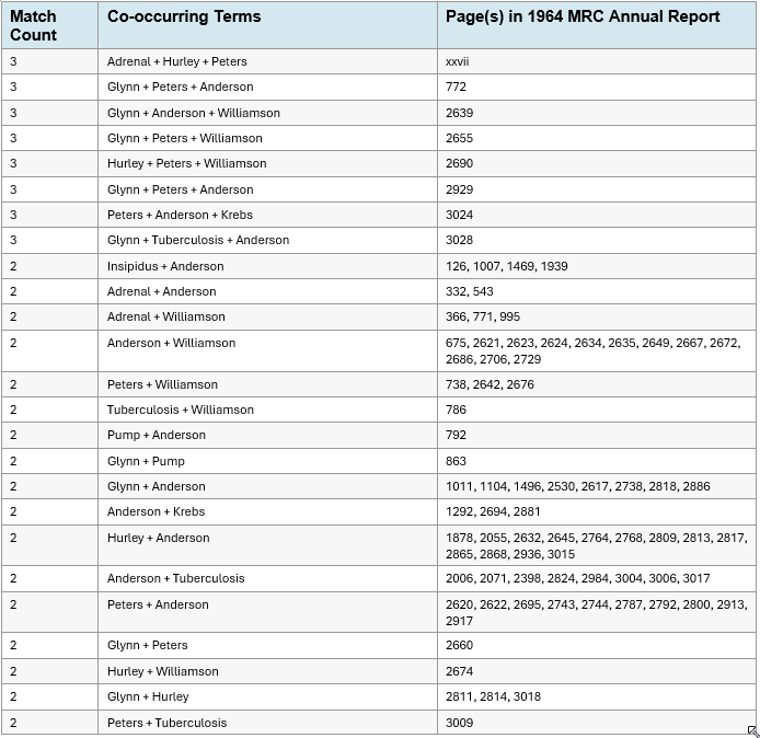 Keyword searches performed on the 1964 Medical Research Council Annual Report and Handbook. Each row represents a unique combination of researcher names or medical terms appearing on the same page. “Anderson” refers to J.R. Anderson (adrenal autoimmunity, Glasgow). Pages grouped by term combination.