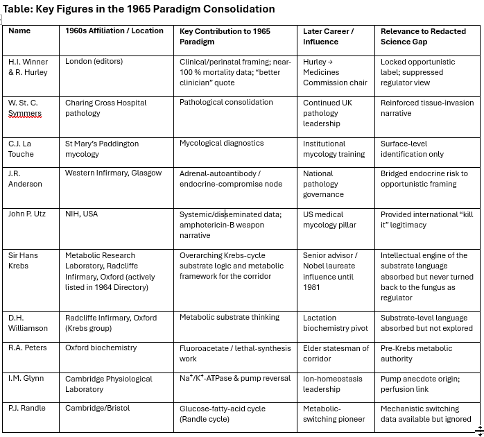 The 1964 Medical Research Council Annual Report and Handbook — the official directory of MRC-funded programs, committee memberships, and grant allocations for that year — contains page-level co-occurrences among researchers who never co-authored a publication [it’s tricky, you cannot read it online, but you can search one word terms, compiling this list took a bit of work]. A systematic keyword search of this document reveals that Rosalinde Hurley (perinatal Candida, Charing Cross), R.A. Peters (metabolic toxicology, Oxford), D.H. Williamson (mitochondrial metabolism, Oxford), I.M. Glynn (Na⁺/K⁺-ATPase, Cambridge), J.R. Anderson (adrenal autoimmunity, Glasgow), and Hans Krebs (Nobel laureate, metabolic biochemistry, Oxford) appear together repeatedly across committee rosters, program summaries, and grant sections. Hurley and Peters share front-matter page xxvii alongside “adrenal.” Glynn, tuberculosis, and Anderson converge on page 3028. Peters, Anderson, and Krebs appear together on page 3024. Anderson is the sole named researcher co-occurring with “insipidus” on four separate pages. These are researchers in different disciplines, at different institutions, who published in different journals and attended different conferences. None of them co-authored work that crossed the boundary between mycology, metabolic biochemistry, and immunopathology. Yet the MRC’s own records place them in the same governance and funding sections, one year before Winner and Hurley convened the symposium that defined Candida albicans as an opportunistic pathogen and excluded every metabolic and biochemical question from the sanctioned conversation. The published literature kept these programs apart. The MRC’s internal paperwork shows they were together. These are areas that overlap precisely in the framework of Redacted Science, but otherwise, they are quite difficult to explain.